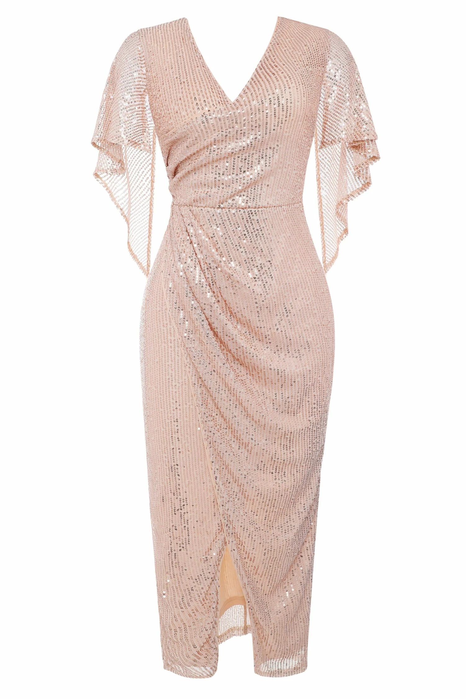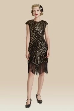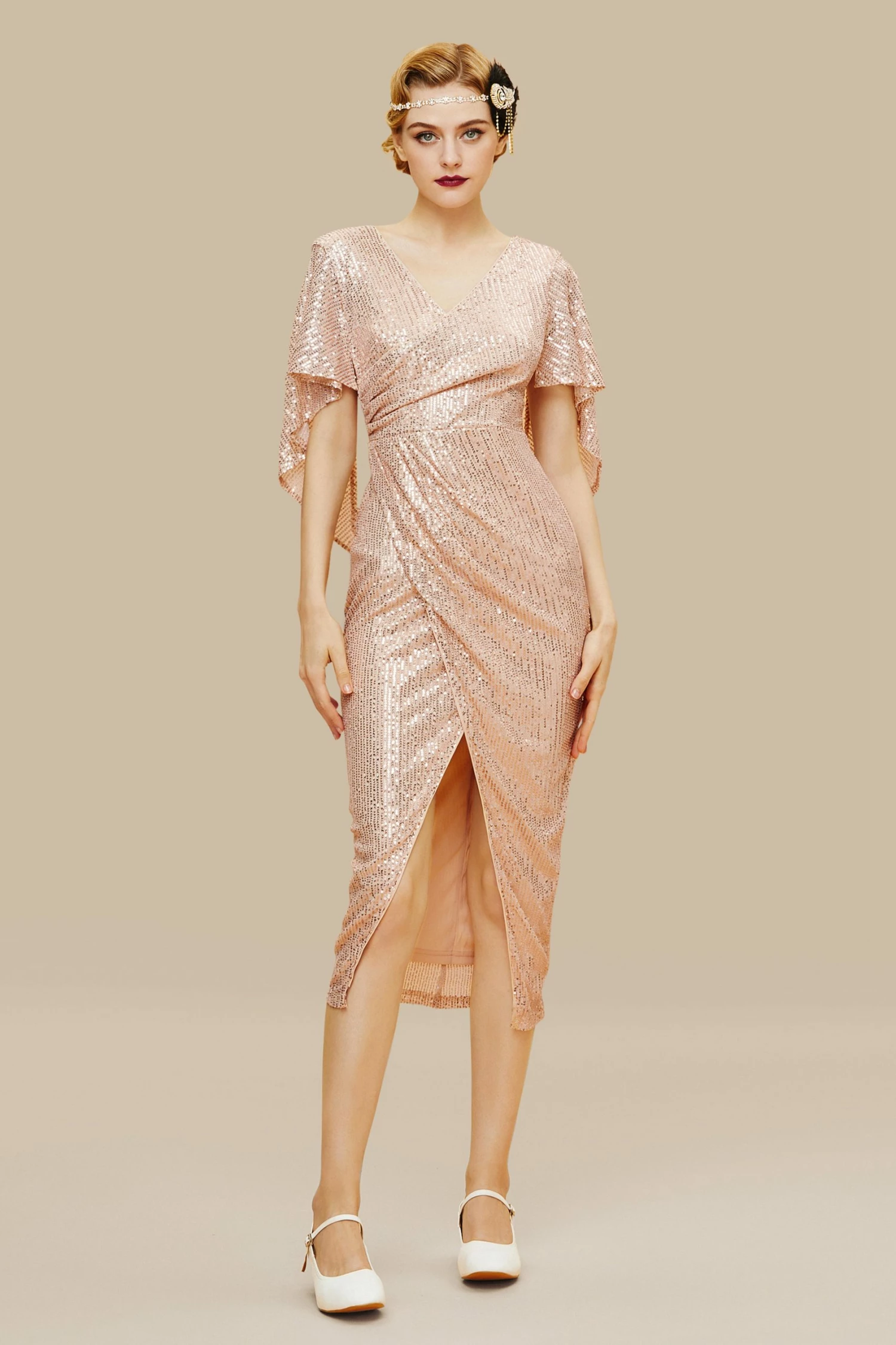 The eyecatching bold v-neck and gold dust coverage design create a unique style for your vintage look. Elegant floor-length dress adorned with shimmering sequins and beading.